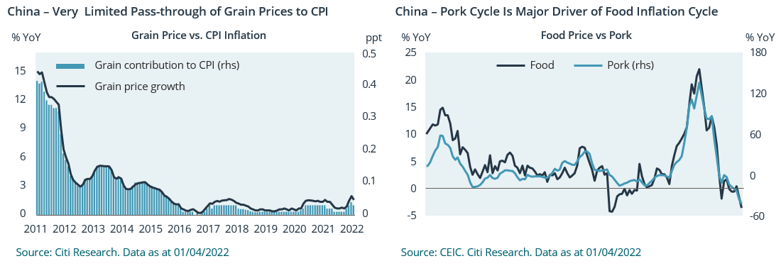In the short to medium term, the demand side of the Chinese economy is likely to stay weak due to uncertainty around exiting Covid, lukewarm stimulus and the structural slowdown of the housing market. Two moving parts driving inflation at the time of writing are the pork supply cycle – a very idiosyncratic factor – and how companies pass Production Price increases to consumers. They have contributed significantly to the variance of the headline number, but we think both are cyclical rather than structural.