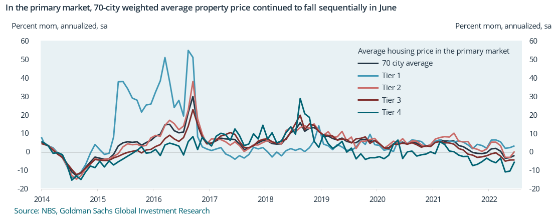 Meanwhile, some large ticket items are seeing prices deflate, dragging down overall headline numbers. Their prices are high compared to developed markets. The most obvious example is housing. Despite relaxing housing purchase restrictions and mortgage policies across the country, except for a few megacities like Shenzhen and Shanghai, most cities’ housing prices were trending down in June and deteriorated in July. Transaction volume also declined, indicating the government’s measures are ineffective, and more importantly, the housing market’s slowdown is structural.