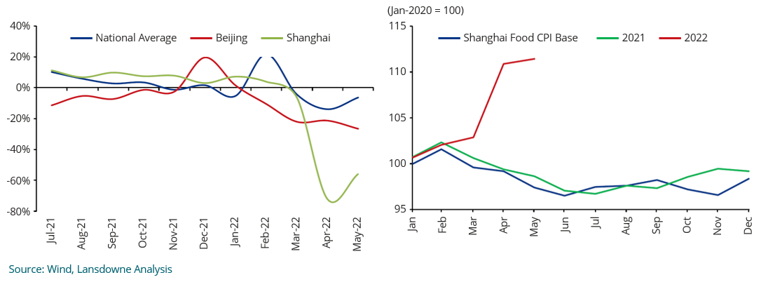 Firstly, unlike the US’s high dependency on import goods, China is largely self-sufficient. One has the largest trade deficit and one has the largest surplus. Global trade activities and logistics have been greatly affected by Covid, causing rising costs and delays. China’s Covid lockdown is local. Logistics outside affected areas have been largely normal. Fresh vegetables and eggs were in shortage as logistics in Shanghai were impeded by the lockdown and strict testing rules, resulting in a local inflation spike. Shanghai’s tracking volume dropped 80% and 60% in April and May respectively, and CPI rose to 4.6% (vs. the national average of only 2.1%). Once the lockdown ended, transportation of goods to Shanghai gradually resumed and the price dropped from its peak. In June, Shanghai CPI dropped to 2.9%.