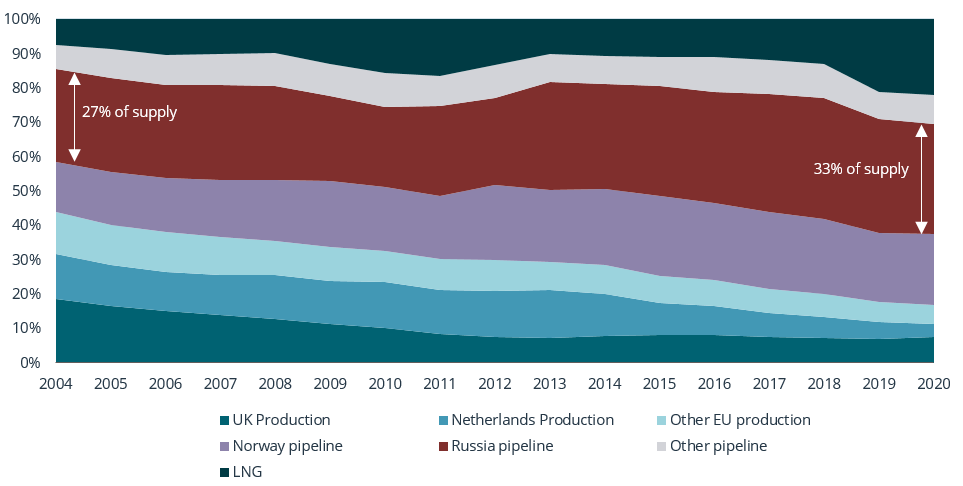 European Gas: Overly Dependent On Russia (EU Gas Supply By Source, %)