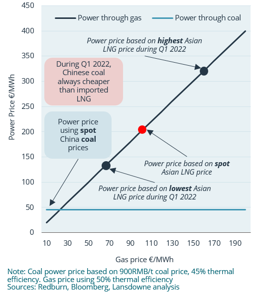 Under the RePower EU strategy, Europe seeks to substitute 50bcm p.a. (37MT) of Russian gas with global LNG imports by the end of 2022. The issue is that incremental demand from Europe would push this year’s global LNG market into deficit of about 7MT (or 2%) and probably also for each of the next three years. Additionally, within the LNG market, the size of uncontracted spot volumes at any point in time is actually quite a lot smaller at about 150 MT of the 400MT p.a. total with the rest unavailable due to pre-agreements. To achieve this year’s objective, Europe must take share of this constrained pool from other purchasing nations. China is the largest consumer of imported LNG at 80MT p.a. and could substitute this by increasing domestic coal production by 300mt p.a. or c. 5% of existing capacity. At currently very elevated levels of gas prices relative to coal, there is a strong economic incentive to do this but paradoxically, Europe’s ambitions towards net zero would then inadvertently have undermined China’s own efforts. Since China is a predominantly coal-centric economy, we estimate the impact of high gas prices are $50 billion p.a., or only 0.3% of GDP, and since the energy system is also state controlled, this is not being passed on directly to the consumer. This implies that China has the flexibility to prioritise its climate ambitions by continuing to purchase LNG if it so chooses making it imprudent for Europe to rely on LNG imports as a sustainable substitute to Russian gas in our opinion.