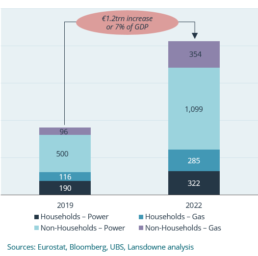 Separately, to analyse the potential increase in energy costs to the European economy, we have built a consumption model for the three principal end markets; heating, power and industrial, and by source i.e. gas, renewables and other. Compared to the pre-covid baseline of 2019, we estimate that Europe’s energy bill on a spot basis has increased by €1.2 trillion or 7% of GDP of which €300 billion for households.