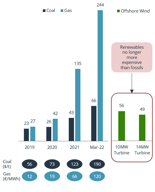Given the explosion in coal and LNG prices, we calculate that it is now cheaper to generate power from offshore wind than from fossil fuels on an LCOE basis whereas it was 2x more expensive as recently as 2019. Critically, regulatory subsidies are thus no longer required for the economics to work. Similarly, the total cost of ownership of an electric vehicle at the consumer level is now 20% lower than for a car that runs on gasoline at current fuel prices, from nearly breakeven only two years ago. The inflection point at which the economic cost of switching to electrified and energy-efficient alternatives has moved into-the-money across a swathe of end markets.